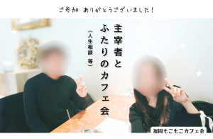 - フリーランス・個人事業主などの家で仕事なので、孤独をうっすらと感じている。仕事や人間関係のしがらみのない関係性の相手と気軽に話をしたいなと思っている。→福岡フリーランス個人事業主系カフェ会(起業初心者さん(起業準備中含む)ワークショップ+交流会カフェ会)へ